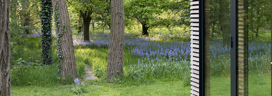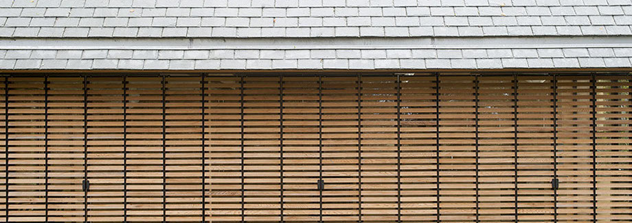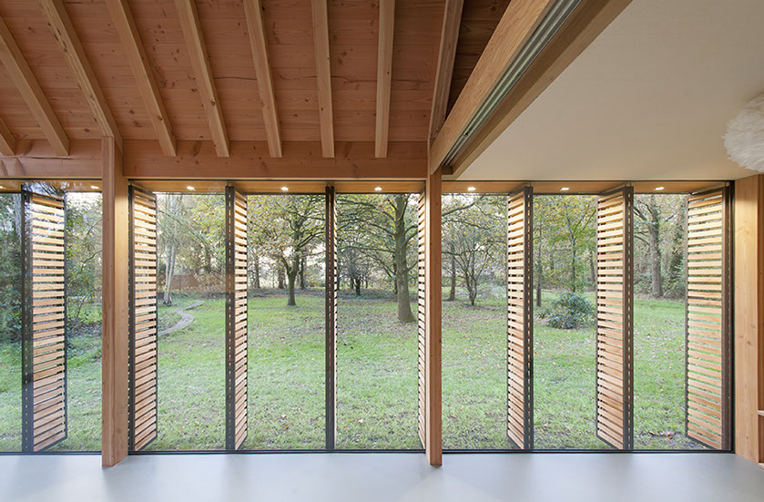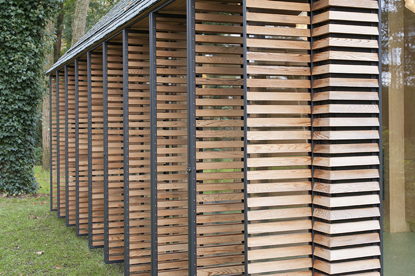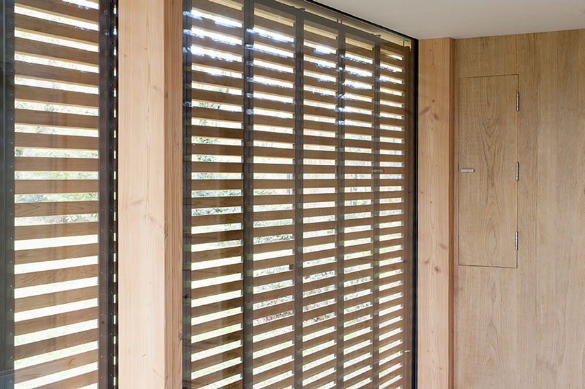 Aan één zijde van het huis is de gevel geheel gesloten doordat de leibedekking van het dak doorgezet is in het verticale gevelvlak. De andere zijde is voorzien van beweegbare luiken en opent zich naar de groene omgeving. De luiken, die bekleed zijn met horizontale latten, regisseren de lichtinval en het zicht op de omgeving evenals zicht van buiten naar binnen. Met dichte luiken krijgt het huisje een gesloten karakter, mede door de horizontale latten van de luiken die doorlopen in de gevelbekleding. De compleet transparante voorkant van het huis richt zich op het open gedeelte van het landschap.