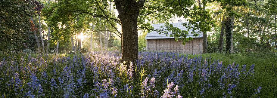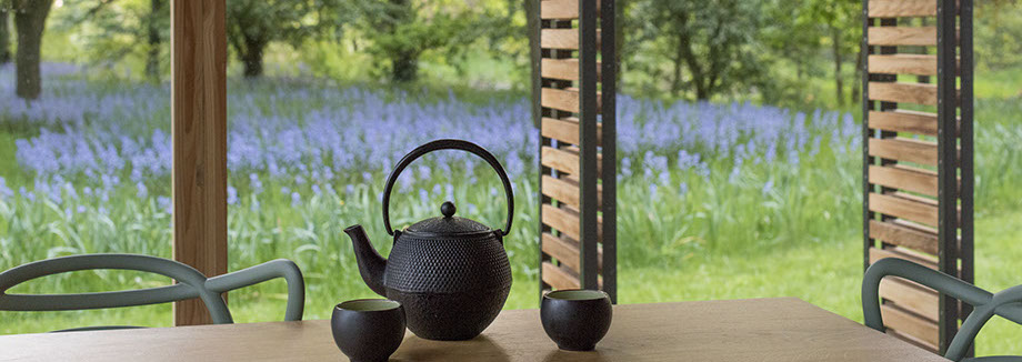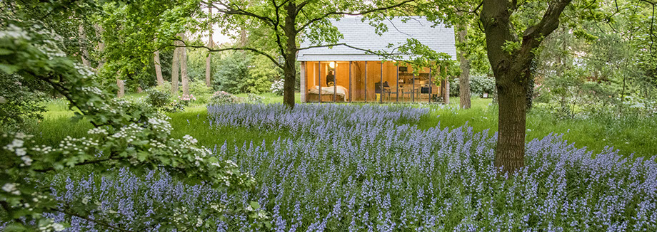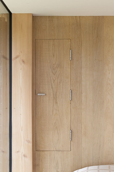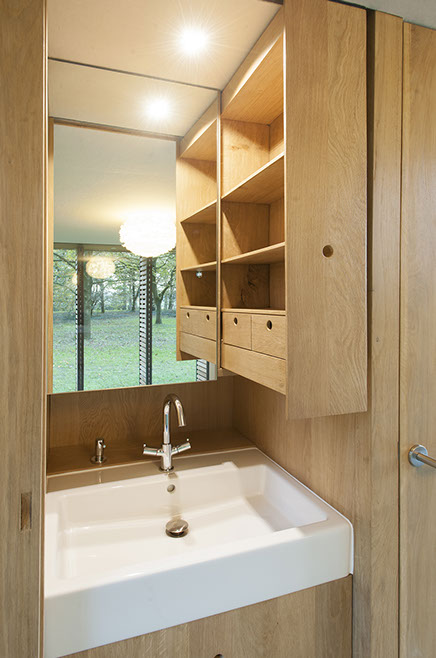 Het voorste, open gedeelte bevat de gecombineerde keuken, woonkamer en eetkamer. In het achterste gedeelte, dat meer gesloten is, wordt geslapen. Schuivende panelen delen de ruimte op. Aan de lange, dichte zijde van het huis zijn voorzieningen als de keuken, badkamer, alle installaties, een houtkachel en verschillende kasten op een slimme wijze geïntegreerd in een eikenhouten wand. Iedere vierkante meter van het tuinhuis is doordacht en benut.