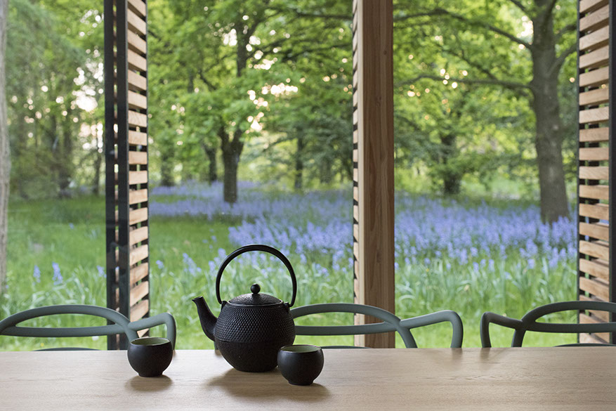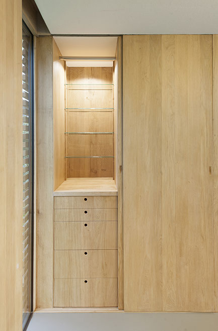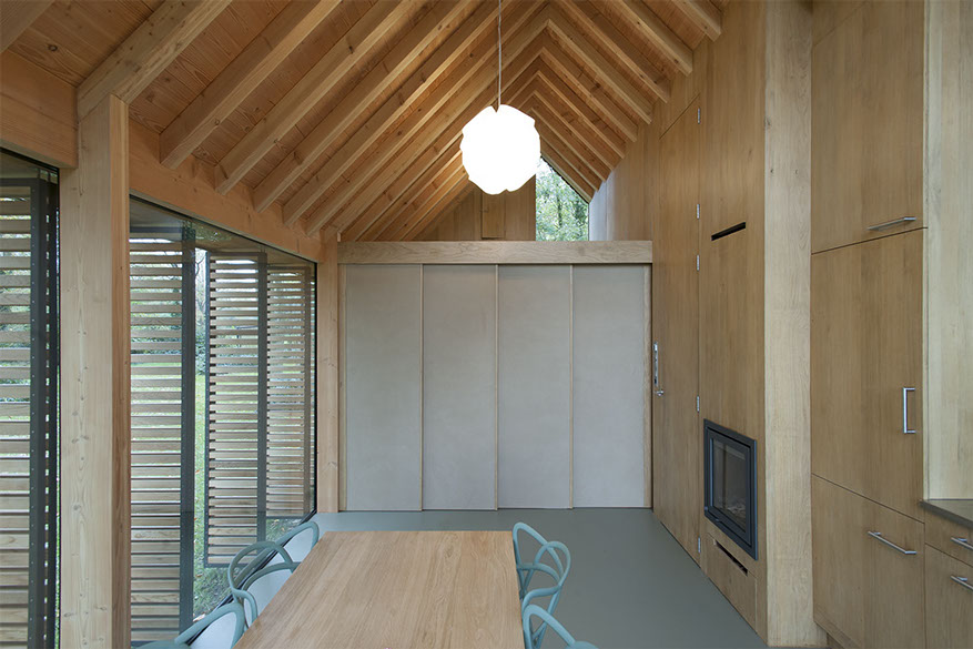 Het voorste, open gedeelte bevat de gecombineerde keuken, woonkamer en eetkamer. In het achterste gedeelte, dat meer gesloten is, wordt geslapen. Schuivende panelen delen de ruimte op. Aan de lange, dichte zijde van het huis zijn voorzieningen als de keuken, badkamer, alle installaties, een houtkachel en verschillende kasten op een slimme wijze geïntegreerd in een eikenhouten wand. Iedere vierkante meter van het tuinhuis is doordacht en benut.