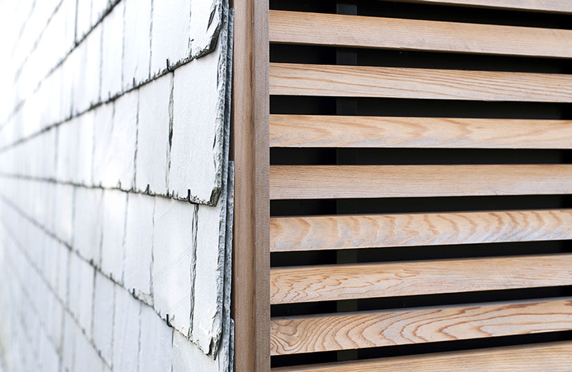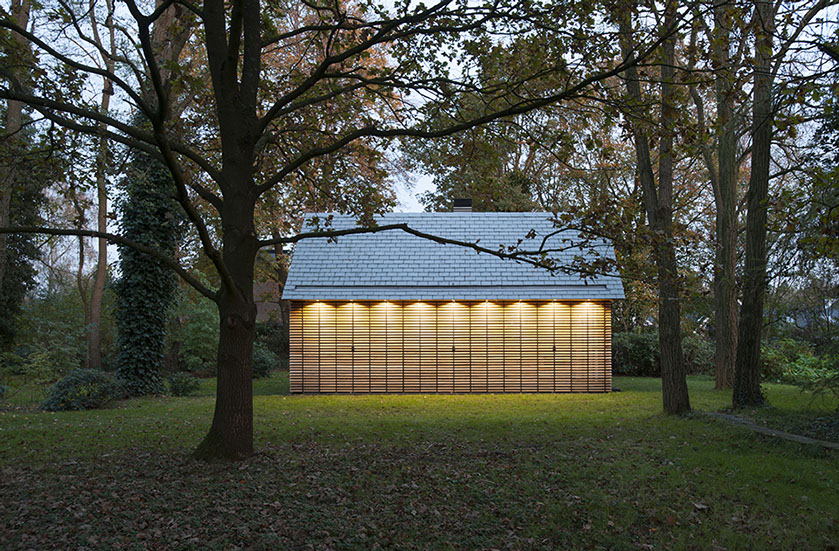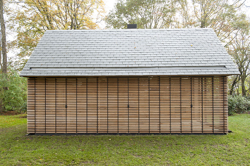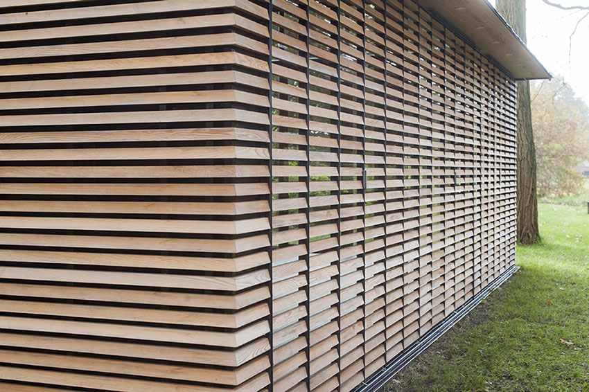 Aan één zijde van het huis is de gevel geheel gesloten doordat de leibedekking van het dak doorgezet is in het verticale gevelvlak. De andere zijde is voorzien van beweegbare luiken en opent zich naar de groene omgeving. De luiken, die bekleed zijn met horizontale latten, regisseren de lichtinval en het zicht op de omgeving evenals zicht van buiten naar binnen. Met dichte luiken krijgt het huisje een gesloten karakter, mede door de horizontale latten van de luiken die doorlopen in de gevelbekleding. De compleet transparante voorkant van het huis richt zich op het open gedeelte van het landschap.
